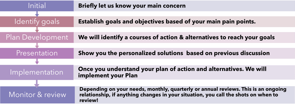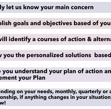 This selection is ideal for individuals seeking guidance on a specific financial concerns, such as budgeting, debt management, retirement planning, asset protection, saving for education or if you are a business owner discussing the needs for your company and/or employee benefits.